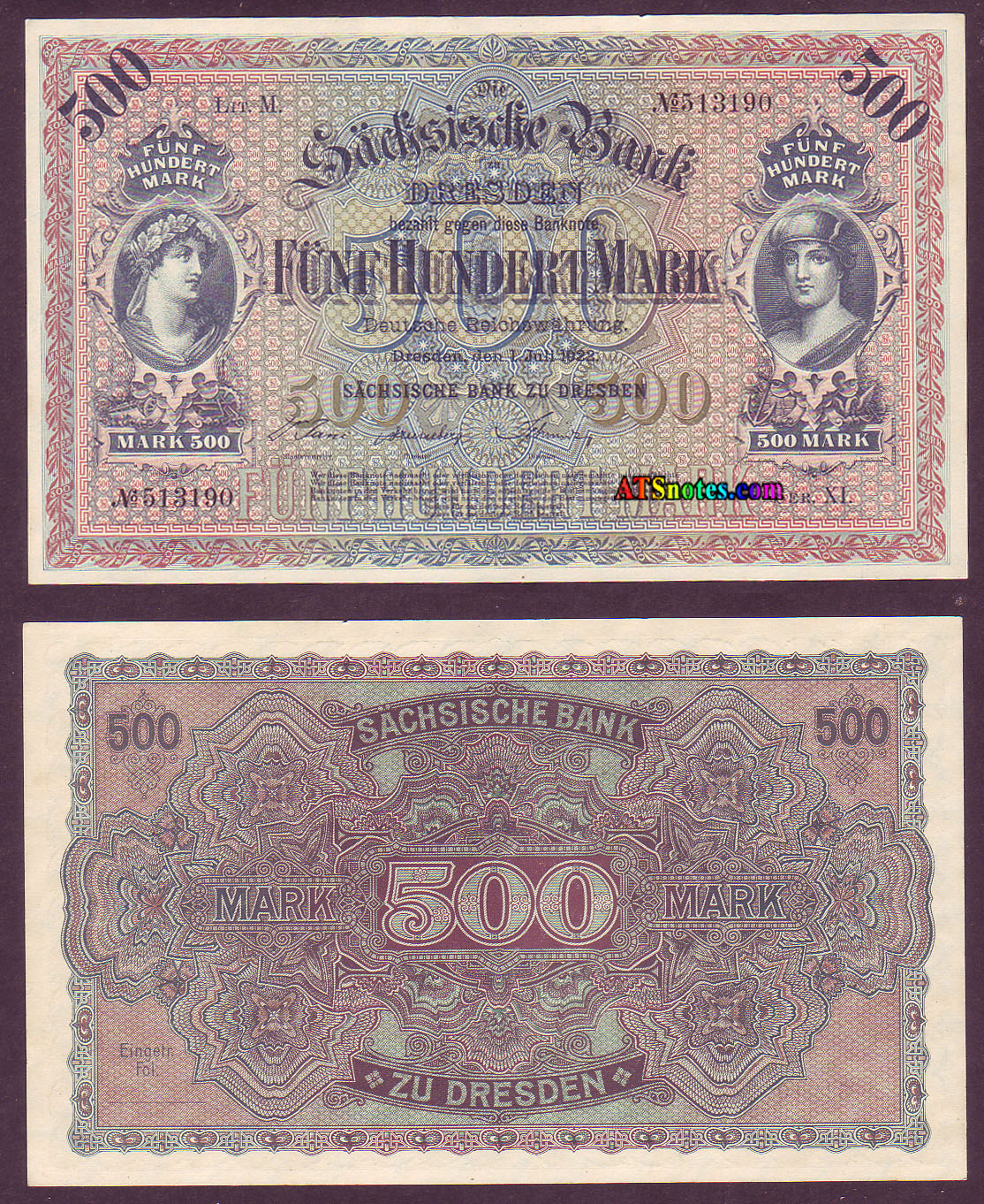 74c. 500 mk 1922 07.07; green#8-digit......... VF 4, UN 30