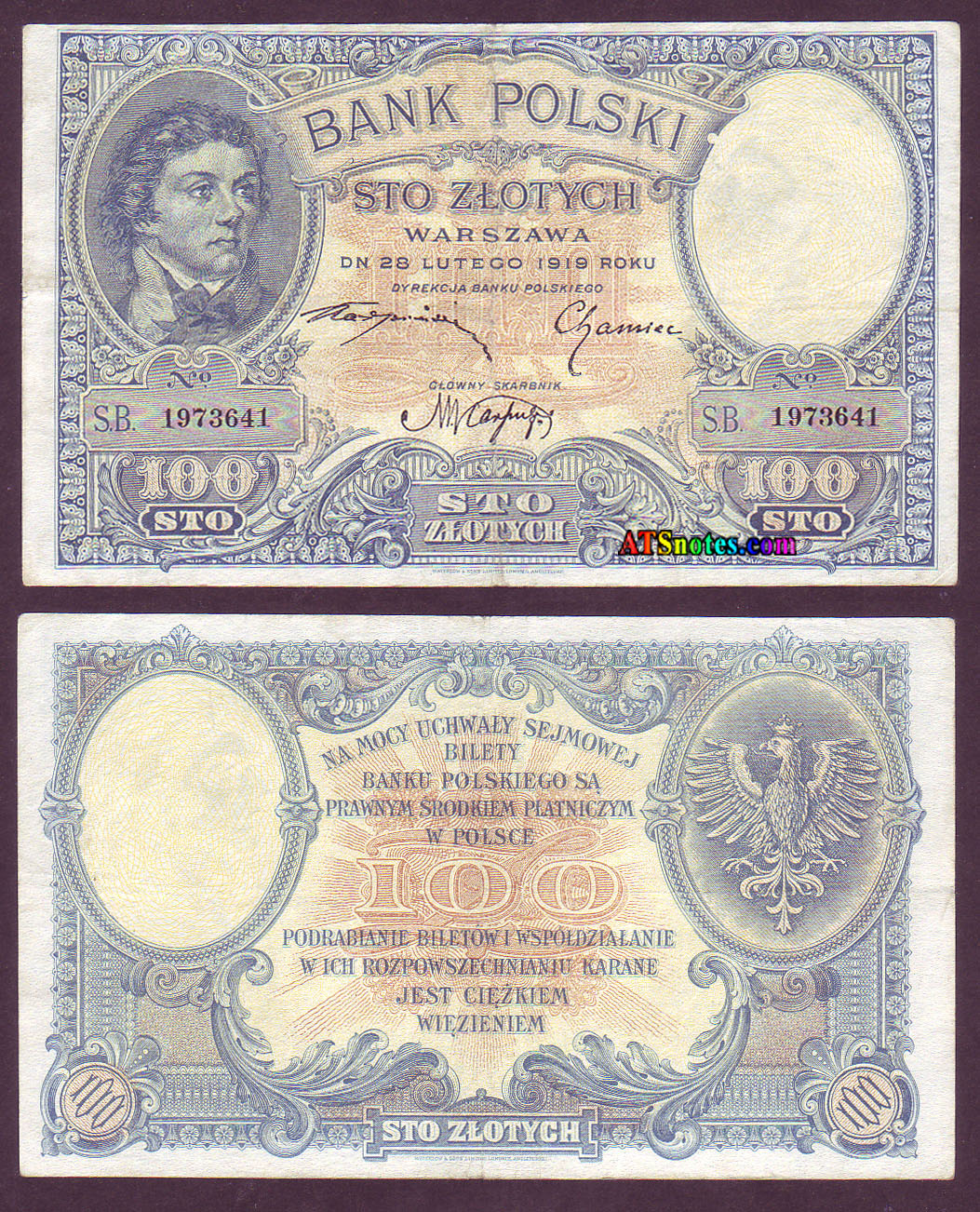 17a Mi18b 100 mk 1919 Kosciuszko..................... VG 50, VF 200
