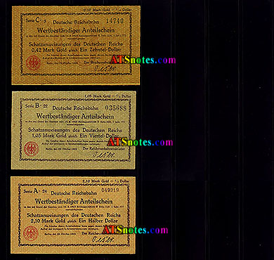 | s1035-40 | 1923.11.07 | 0.42=1/10$, 1.05=1/4$, 2.10=1/2$, 4.20=1$, 8.40=2$, 21=5$; "Geldscheine" |